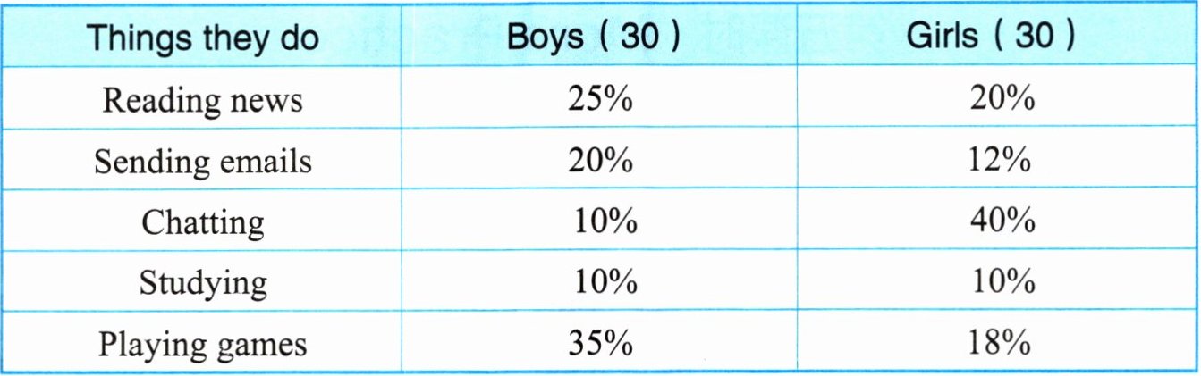 According to the survey, 25% of the 30 boys read news, while 20% of the 30 girls do the same. 20% of the boys send emails, compared to 12% of the girls. When it comes to chatting, 10% of the boys chat online, but 40% of the girls enjoy chatting. Both 10% of the boys and girls use the Internet for studying. As for playing games, 35% of the boys play games, while only 18% of the girls do.