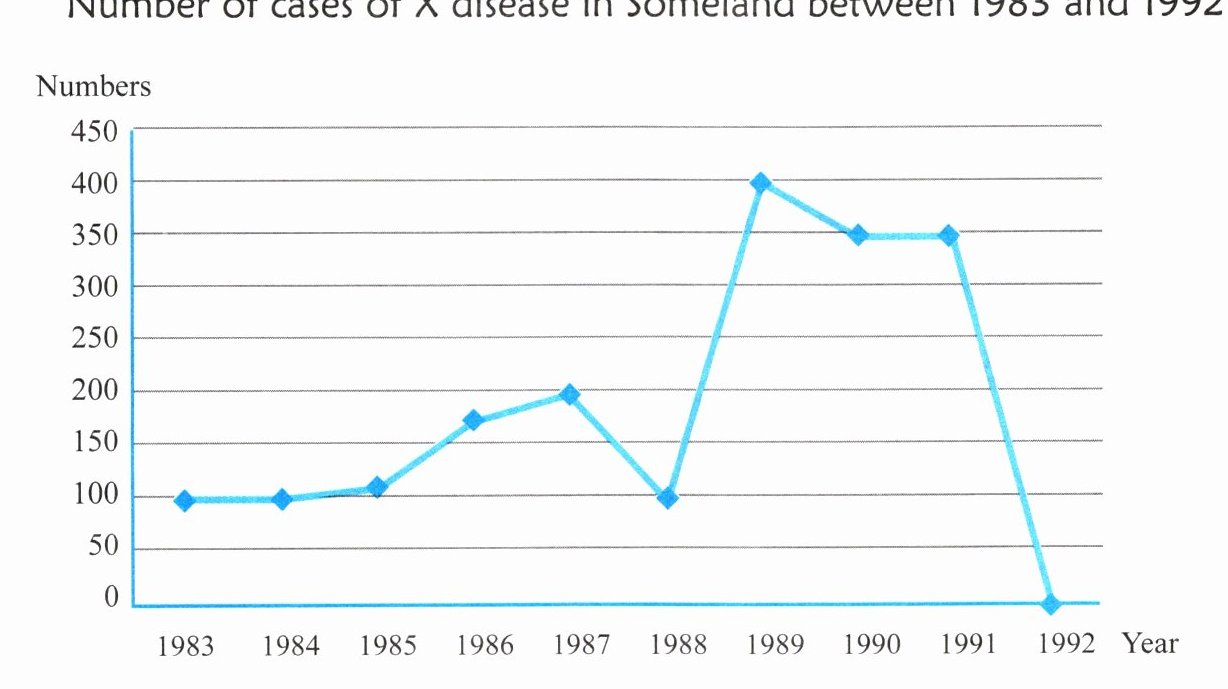 Look at the line graph about the number of cases of X disease in Someland between 1988 and 1992. The graph shows that there were 100 cases of X disease in 1988 in Someland. In 1989, the number rose to 400 and then fell to 350 in 1990. In 1992, the number fell again to 0.