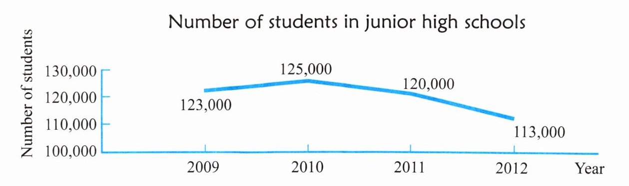 Look at the line graph above about the number of students in junior high schools in May's city. The graph shows that there were 123,000 students in 2009 in May's city. In 2010, the number rose to 125,000 and then fell to 120,000 in 2011. In 2012, the number fell again to 113,000.