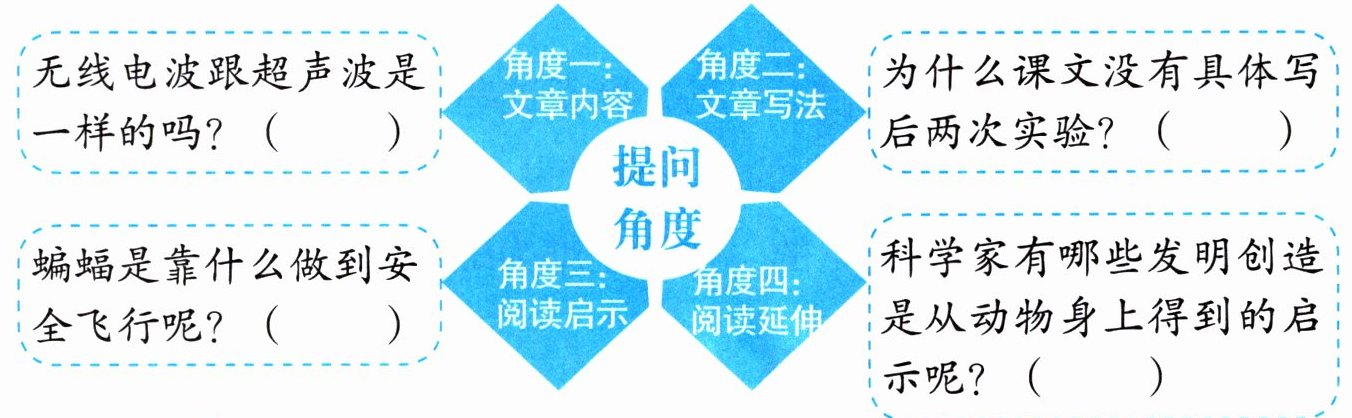 一、阅读时可以试着从不同角度提出问题。以《夜间飞行的秘密》为例,判断这些问题是否符合相应的提问角度,对的打“√”,错的打“×”