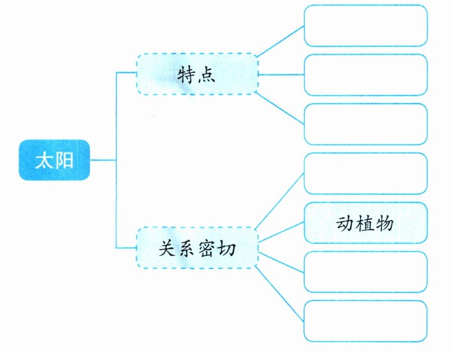 (图中文字:太阳 特点 ____ ____ ____ ____ ____ 关系密切 动植物 ____ ____ ____ )