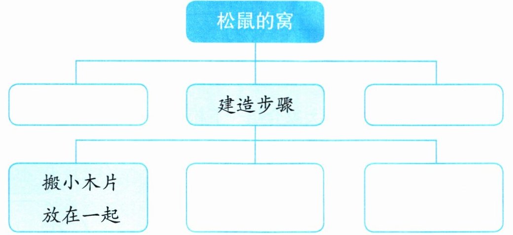 1. 片段围绕“松鼠的窝”依次介绍了哪三方面的内容?松鼠建窝的步骤是怎样的?请完成下图。