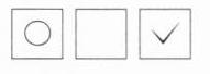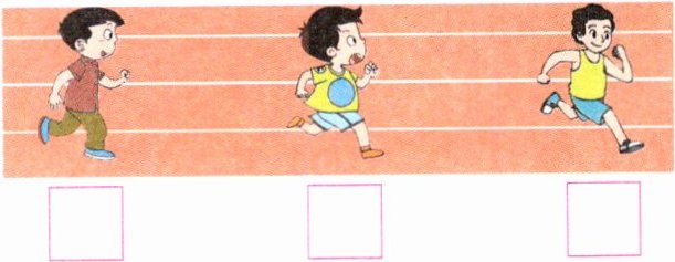 3 个小朋友比赛跑步,在最前面小朋友的下面画“√”,在最后面小朋友的下面画“$◯$”。