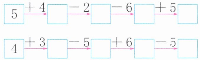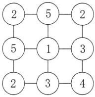 解析:解决此类问题时,要从已知两个数的那一条线开始填。此题可以先填出最上面一行缺少的数,9−2−5=2,可知右上角填2。根据这种方法,依次填出其他数。