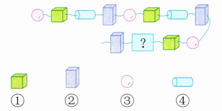 解析:解决此类问题时,要先找到图形的排列规律,此题的排列规律是○、□、○、□,像这样每4个为一组,重复排列。题中要求正方体后面的一个图形,根据排列规律,正方体后面的一个图形是圆柱,所以此题应填④。
