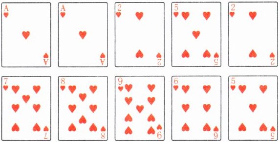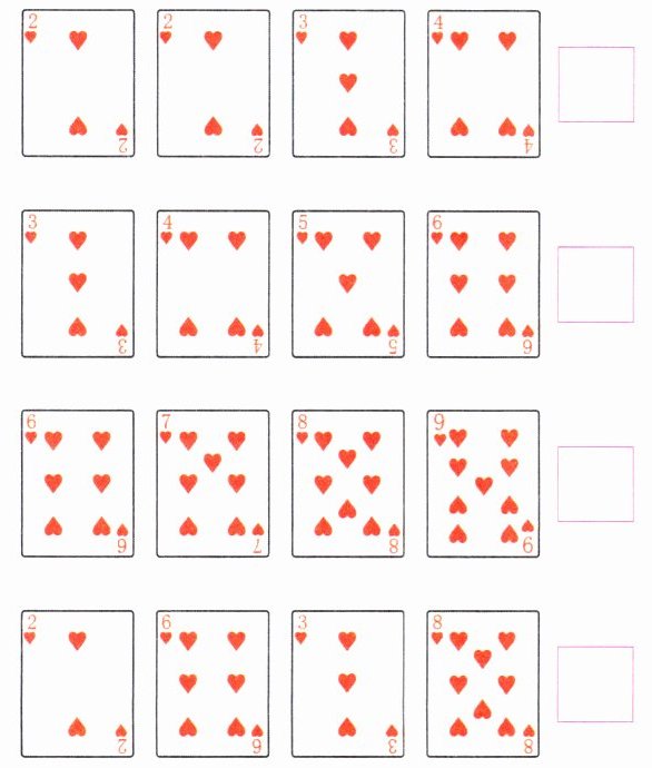 把相加等于 10 的牌拿出来,可以有哪些不同的拿法? 最多可以拿出几张牌? 最少呢?