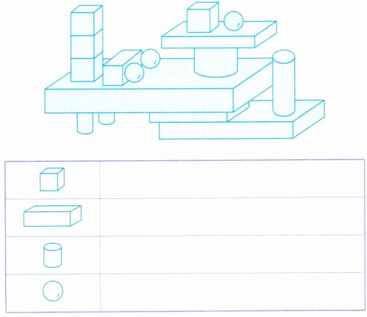3. 下面用积木搭成的图形中,各种形状的积木分别用了几块?先数一数,有几块就在后面画几个“$◯$”。