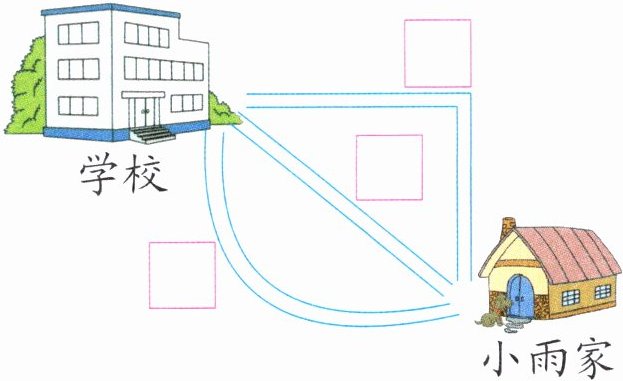 4. (生活体验)小雨放学回家,走哪条路最近?在$□$里画“√”。