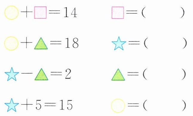 4 10 8 10 解析:哪道算式里只有一个未知图形,就从那道算式算起。根据第四道算式☆+5=15,可以得出☆=10。把☆=10代入第三道算式,可以得出△=8。把△=8代入第二道算式,可以得出○=10。把○=10代入第一道算式,可以得出□=4。其中,算式中的☆对应图片