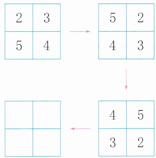 易错分析:此题不容易找到规律。观察前三幅图,发现每幅图中的数字都是2、3、4、5,且从上一幅图到下一幅图,数字的位置按照时针转动的方向移动一格。由此可填出第四幅图中的数字。