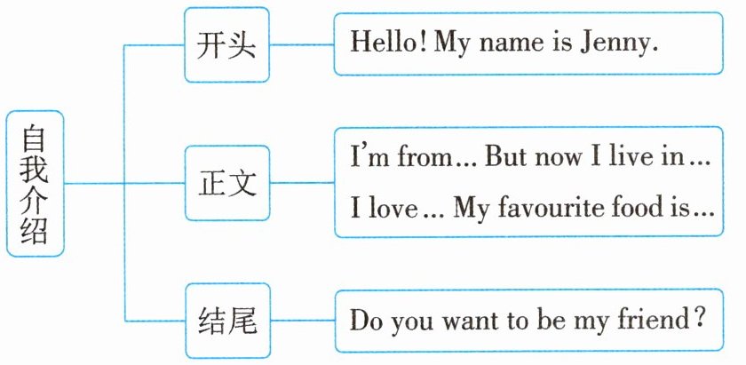 - 正文:I'm from... But now I live in... I love... My favourite food is...