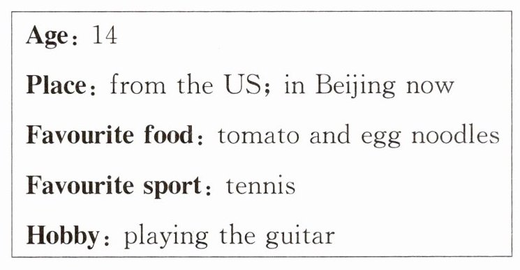 Hello! My name is Jenny. I'm 14 years old. I'm from the US. But now I live in Beijing with my family. My classmates are nice to me. I'd like to make friends with them. I love Chinese food. Tomato and egg noodles are my favourite. My favourite sport is tennis. I often play it with my friends. After school,I like playing the guitar. It's funny.