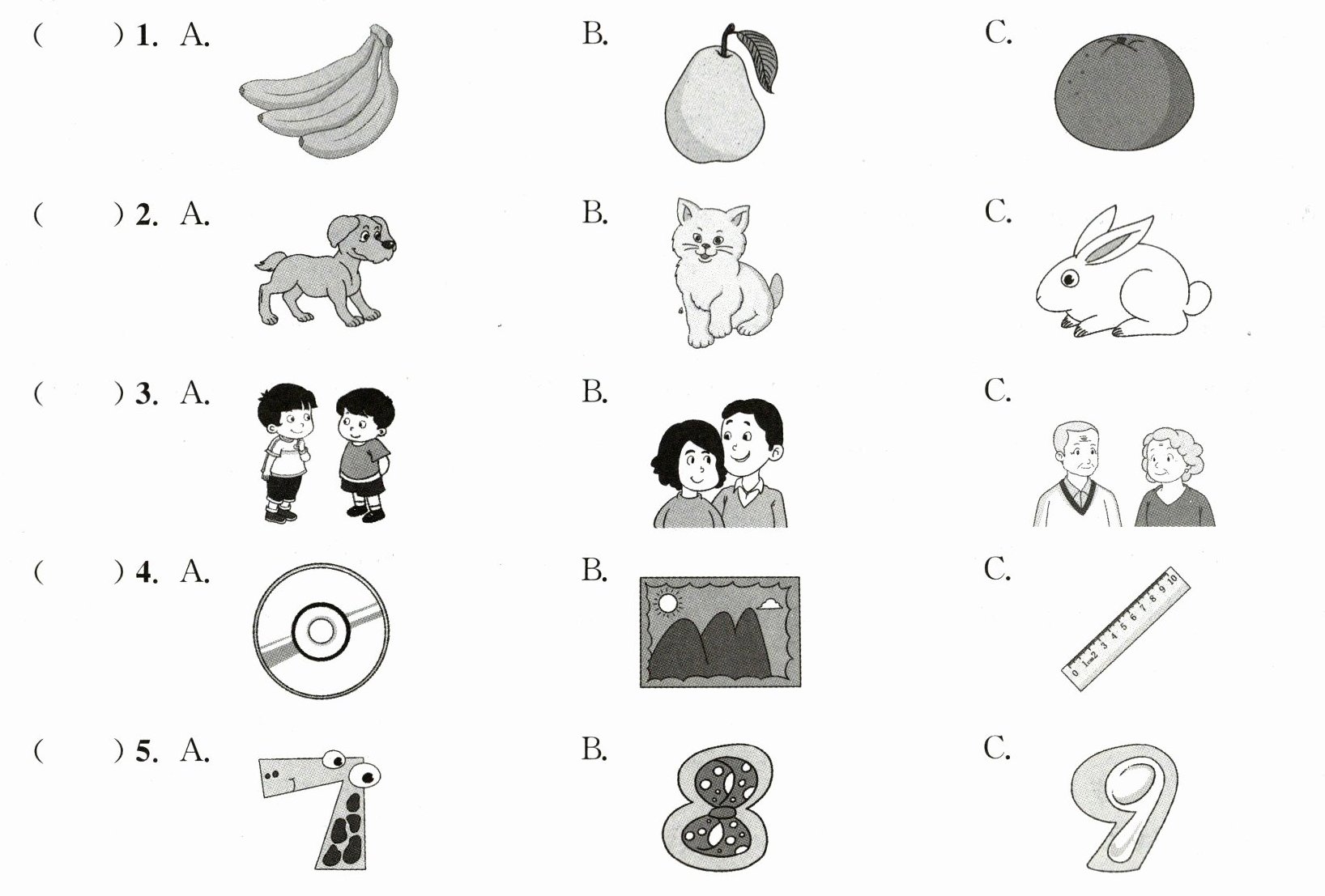 本题共有五个小题,每小题你将听到一组对话。请从每小题所给的 A、B、C 三幅图片中,选出与你所听到的信息相关联的一项。