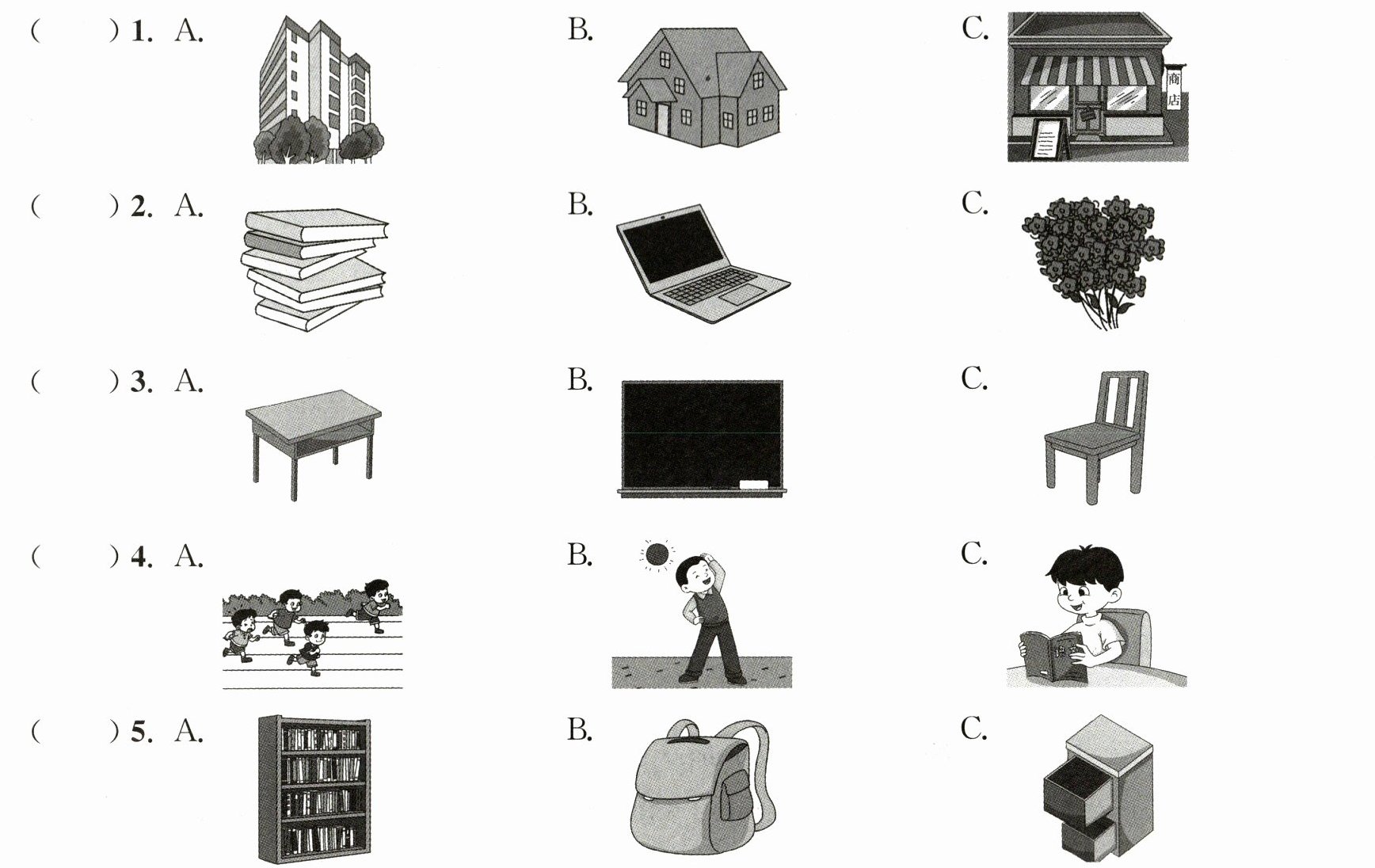本题共有五个小题,每小题你将听到一组对话。请从每小题所给的A、B、C三幅图片中,选出与你所听到的信息相关联的一项。