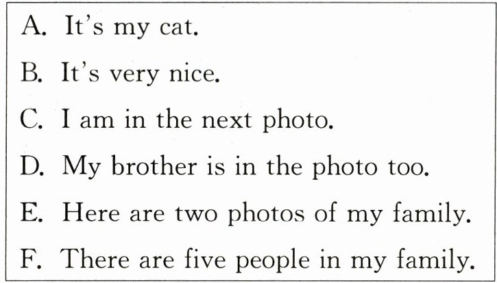 Thank you for your family photo. 49 Now let me tell you about my family. I have a happy family. 50 They are my grandparents, my parents and I. 51 In the first photo, there are four people. They are my grandparents, my father Peter Smith and my mother Helen Smith. Where am I? Oh! 52 This is a photo of my room. It looks tidy. My books are in the bookcase and my schoolbag is on the desk. What’s under the desk? 53 Its name is Mimi.