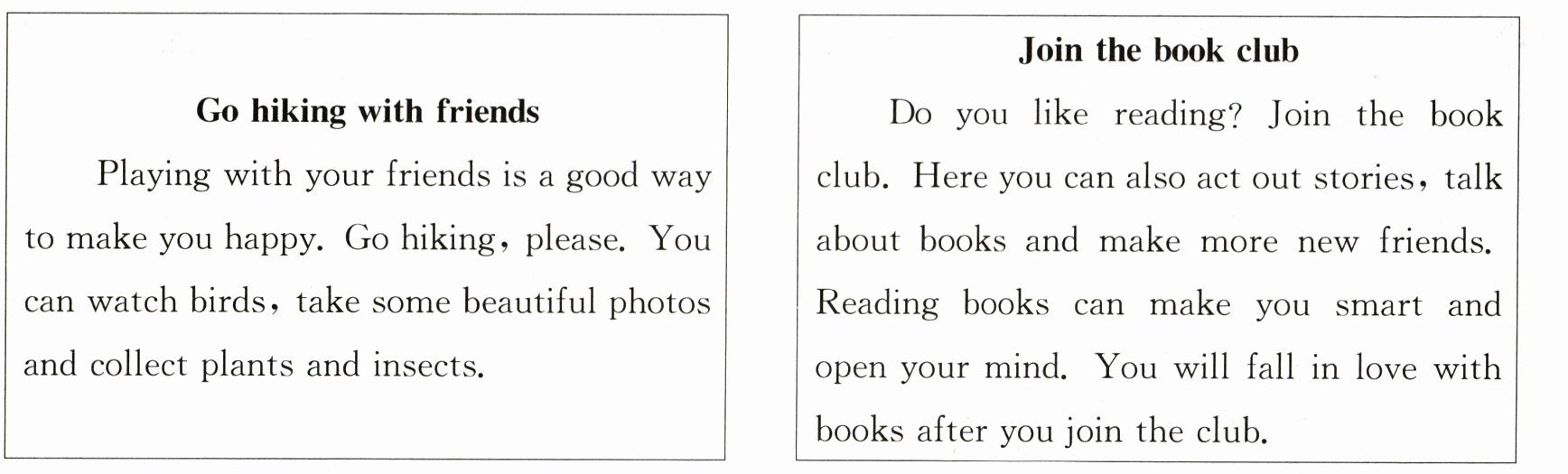 54. Five./5. 55. I can watch birds, take some beautiful photos and collect plants and insects. 56. On paper or computers. 57. My friends or family members. 58. I can take a trip with my best friends.(本小题答案不唯一,言之有理即可)
