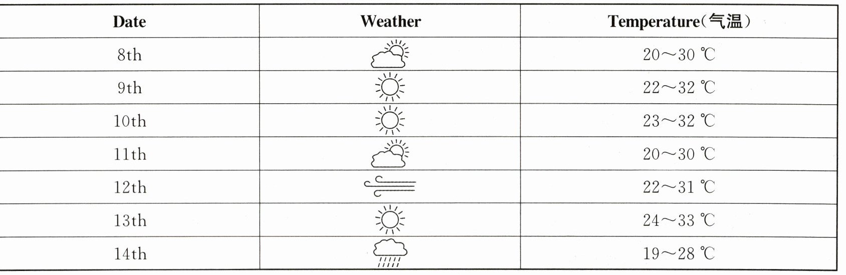 Ann is an American girl. She wants to go to Beijing from 8th to 14th this month. It is her first time going to Beijing, so she wants to know something about it. She wants to know how the weather is, what kind of clothes she needs to wear, and where she can live. She wants to know the weather most. Here is the weather forecast (预报) for Beijing.