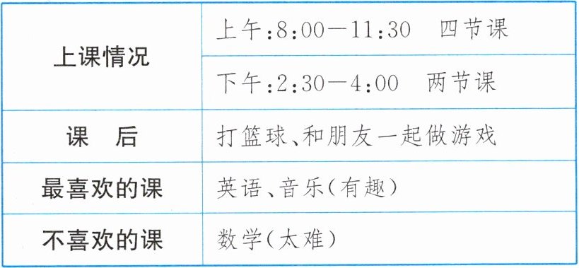 在学校的生活情况,请根据下表内容给 Alan 回