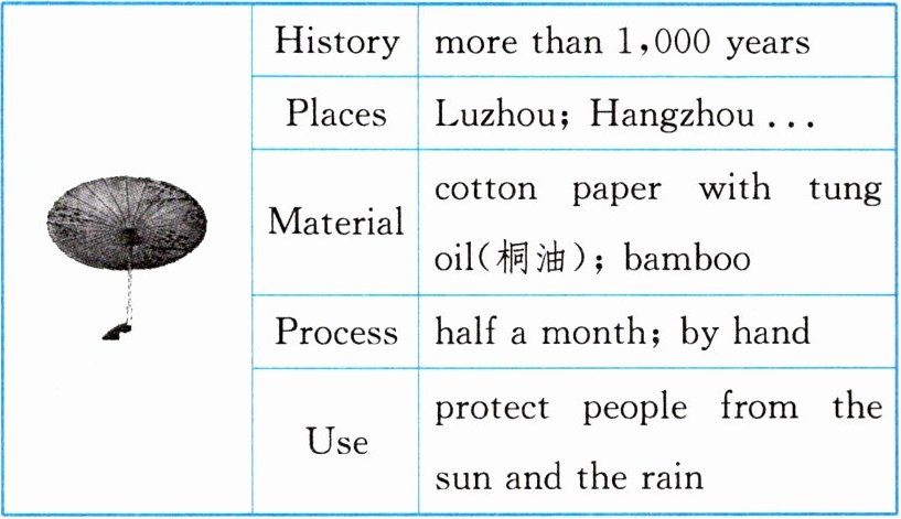 (2024·牡丹江期中改编)假设你是豪华,是你校英文报的一名编辑。本期你打算在你负责的专栏“Traditional Chinese Art”中介绍中国特色产品油纸伞(oil - paper umbrella)。请你根据以下提示,以“The oil - paper umbrella”为题写一篇英语短文,词数80左右。