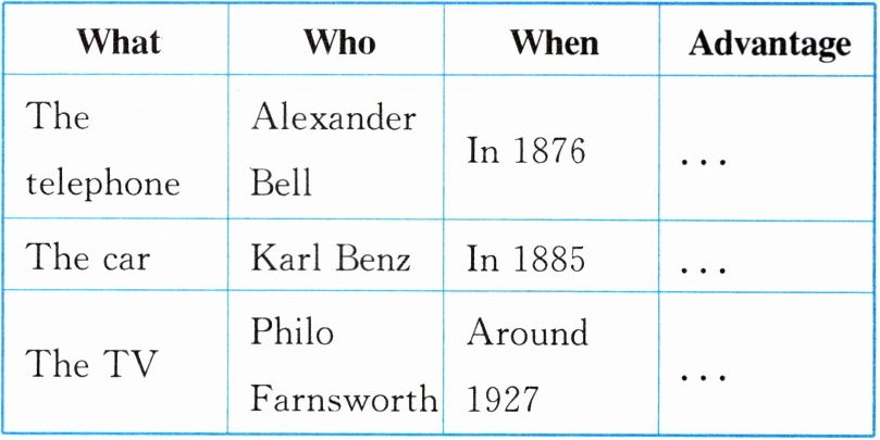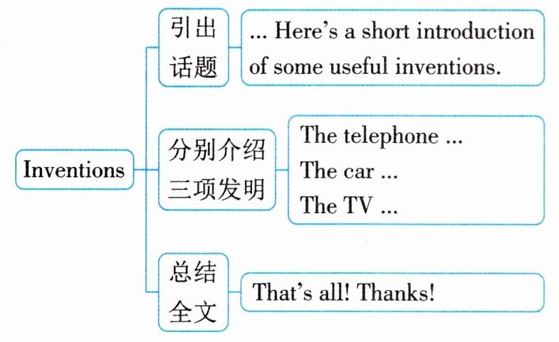 ③ 在写作时,第一步引出话题;第二步分别介绍电话、汽车和电视的发明者、发明时间和使用价值;第三步总结全文。