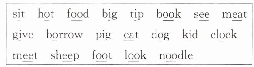 1. sit big tip give pig kid 2. see meat eat meet sheep 3. book foot look 4. food noodle 5. hot borrow dog clock
