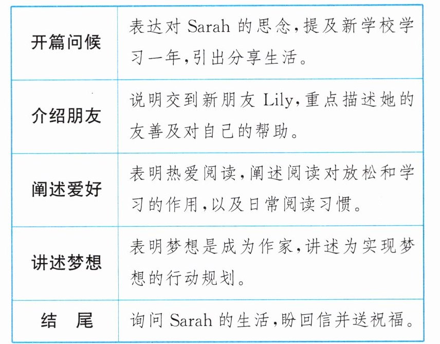 I've made new friends. Lily is especially kind. She often helps me with my study and gives me some suggestions when I face challenges. We often talk and she makes me feel at home. I love reading. It helps me relax and learn. I read for an hour every day after school. I dream of being a writer. To make it come true, I'll read more, write every day, and join a writing club. How's your life? Write back soon. Best wishes.