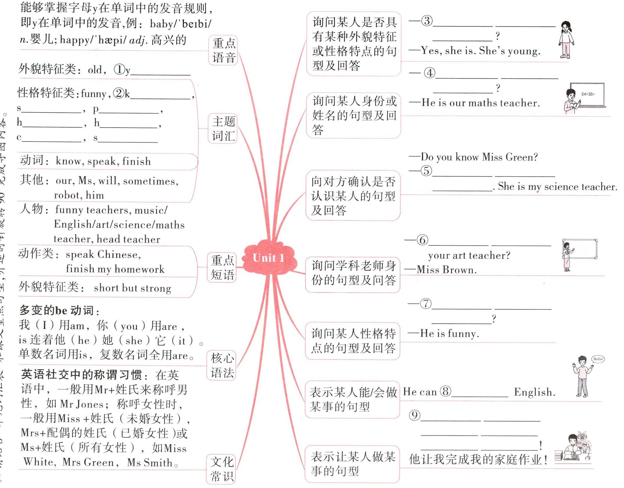 ①(y)oung ②(k)ind, (s)trict, (p)olite, (h)ard-working, (h)elpful, (c)lever, (s)hy ③Is she young