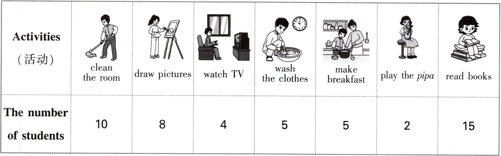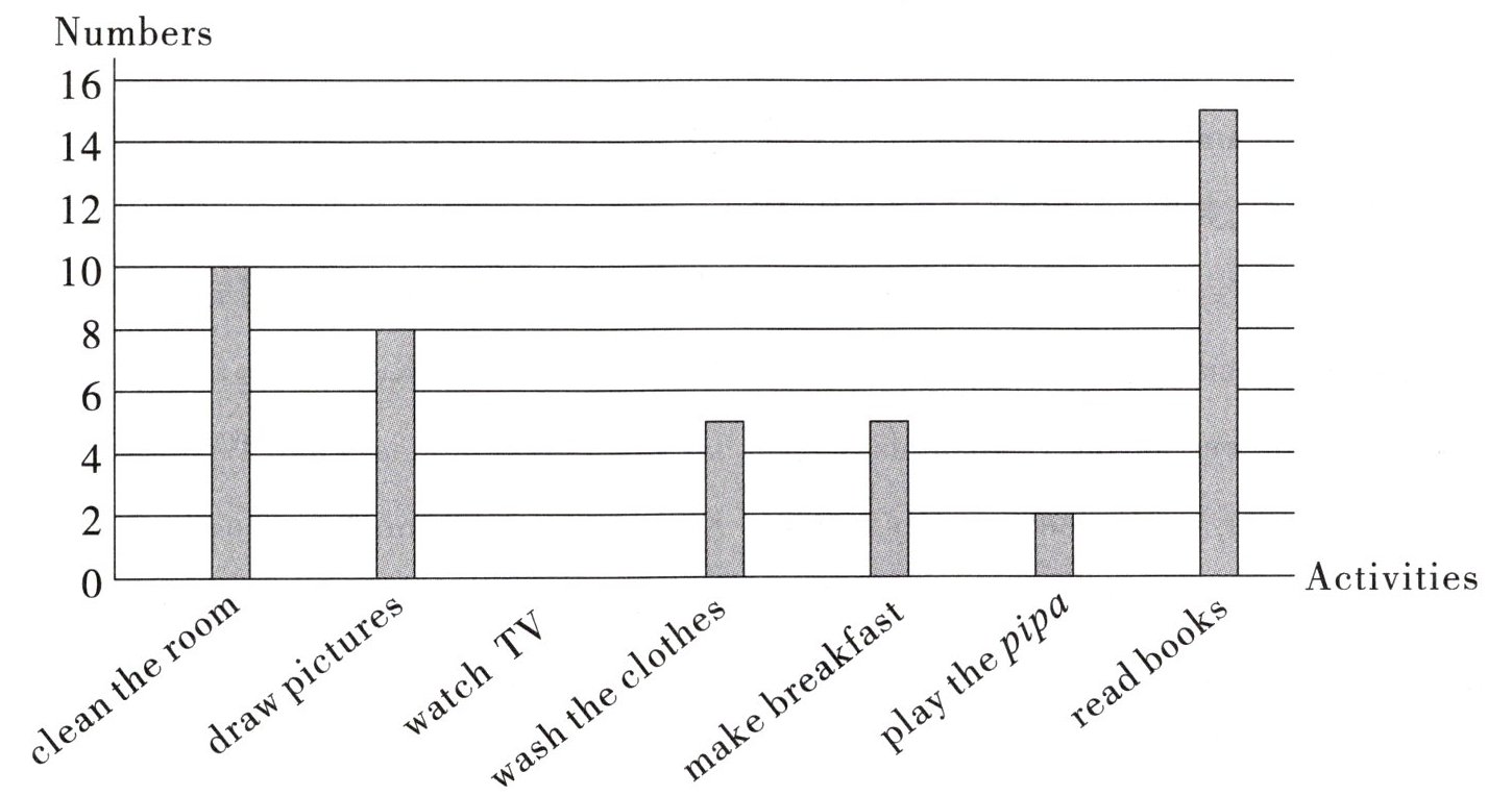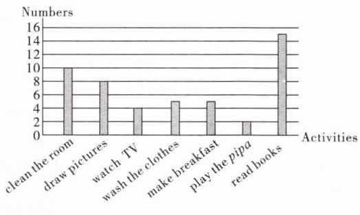 The students’ weekend activities are really colorful! Ten of them help their fathers and mothers clean their rooms and five students wash their clothes. How helpful they are! Some students like drawing pictures and playing the pipa. Four students often watch TV on the weekend. Five students make breakfast. And fifteen students like reading books. They are very hard-working. But no one likes sports. Sports can make us healthy( 健康的) and strong. We should do more sports.