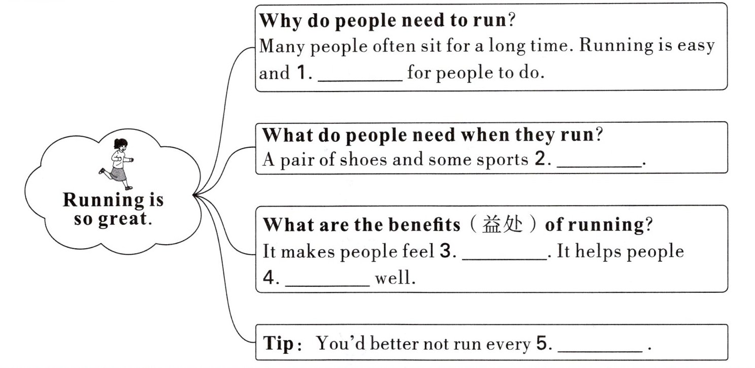 Ⅲ. Read and complete. 妙妙意识到了运动的重要性,阅读她分享的有关跑步的好处,完成下列任务。
