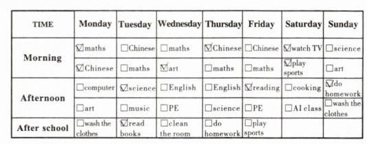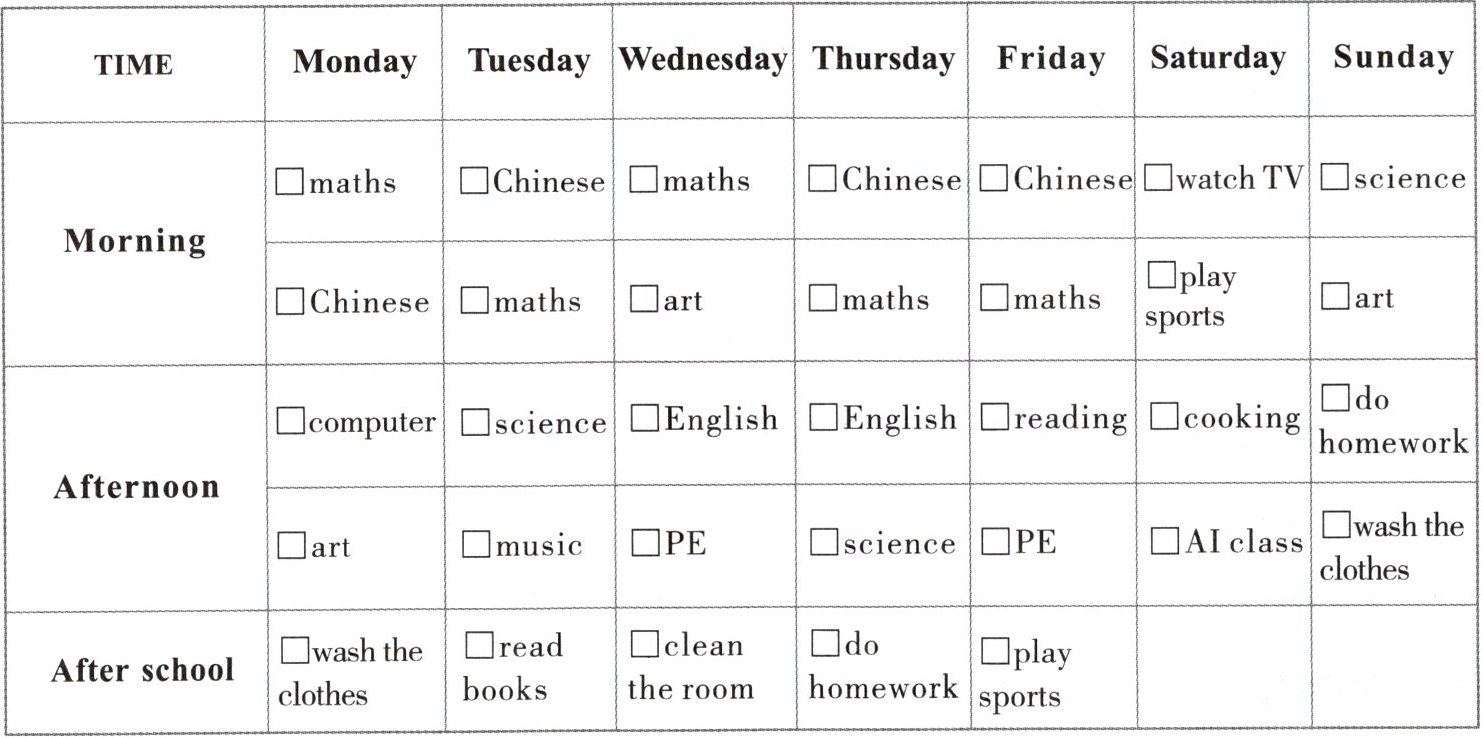 Ⅲ. Listen and tick. 妙妙向大家展示了自己一周的计划表,听她的分享,在你听到的课程及活动前的方框中打“√”。(短文听两遍)