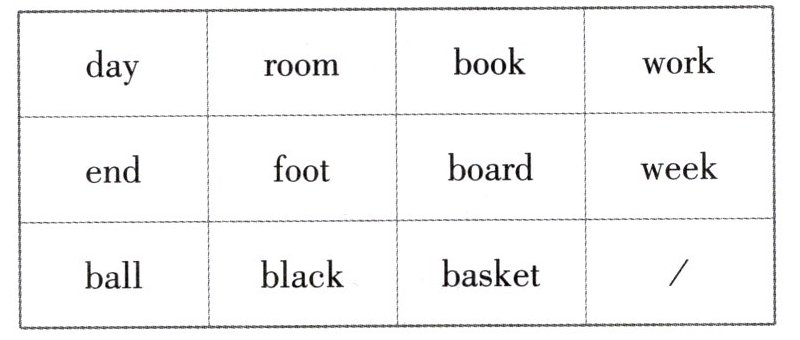 任务一:① Mon;day;Tues;day;Wednes;day;Fri;day;Satur;day;Sun;day ② bed;room;class;room;bath;room ③ foot;ball;basket;ball ④ week;end