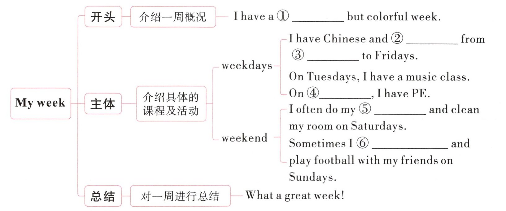 I have a busy but colorful week. I have Chinese and maths from Mondays to Fridays. On Tuesdays, I have a music class. I like to sing songs. On Wednesdays, I have PE. I can play basketball very well. Weekends are happy days for me. I often do my homework and clean my room on Saturdays. And sometimes I watch TV and play football with my friends on Sundays. What a great week!