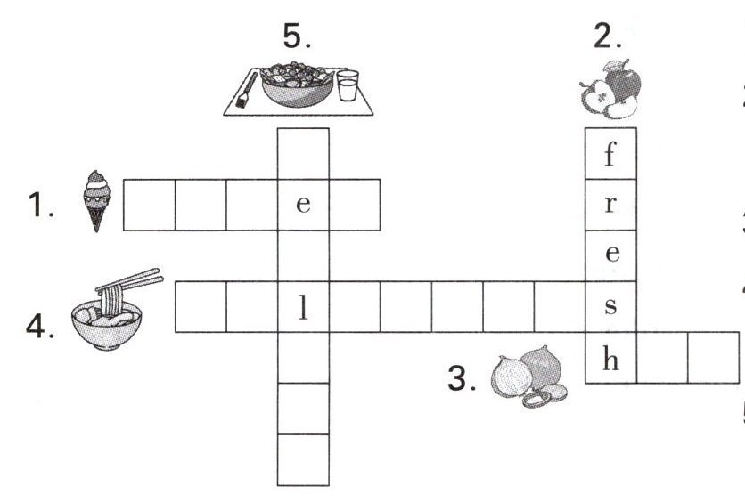 Ⅰ. Read and write. 美食街的食物真多,根据图片和字母提示填写合适的单词,补全句子并完成字谜。