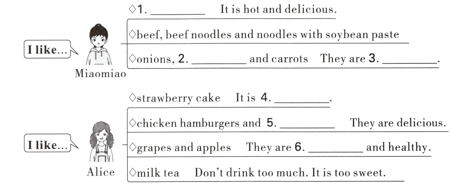 Ⅲ. Read and complete. 读一读妙妙和 Alice 对自己喜欢的食物的介绍,完成思维导图。