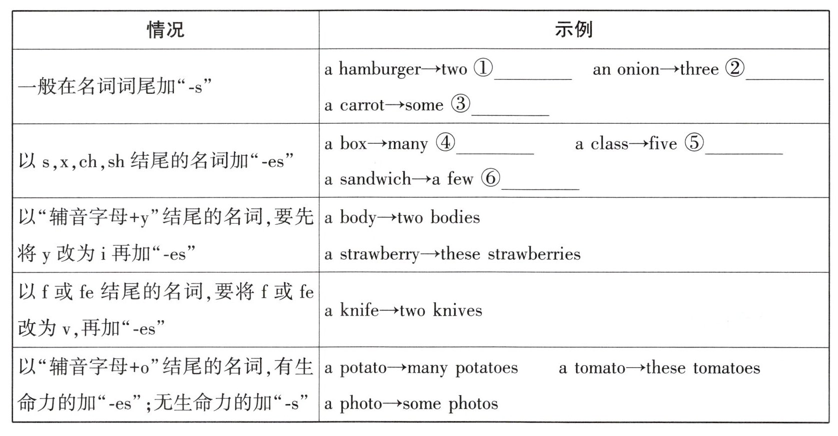 任务三:①hamburgers ②onions ③carrots ④boxes ⑤classes ⑥sandwiches