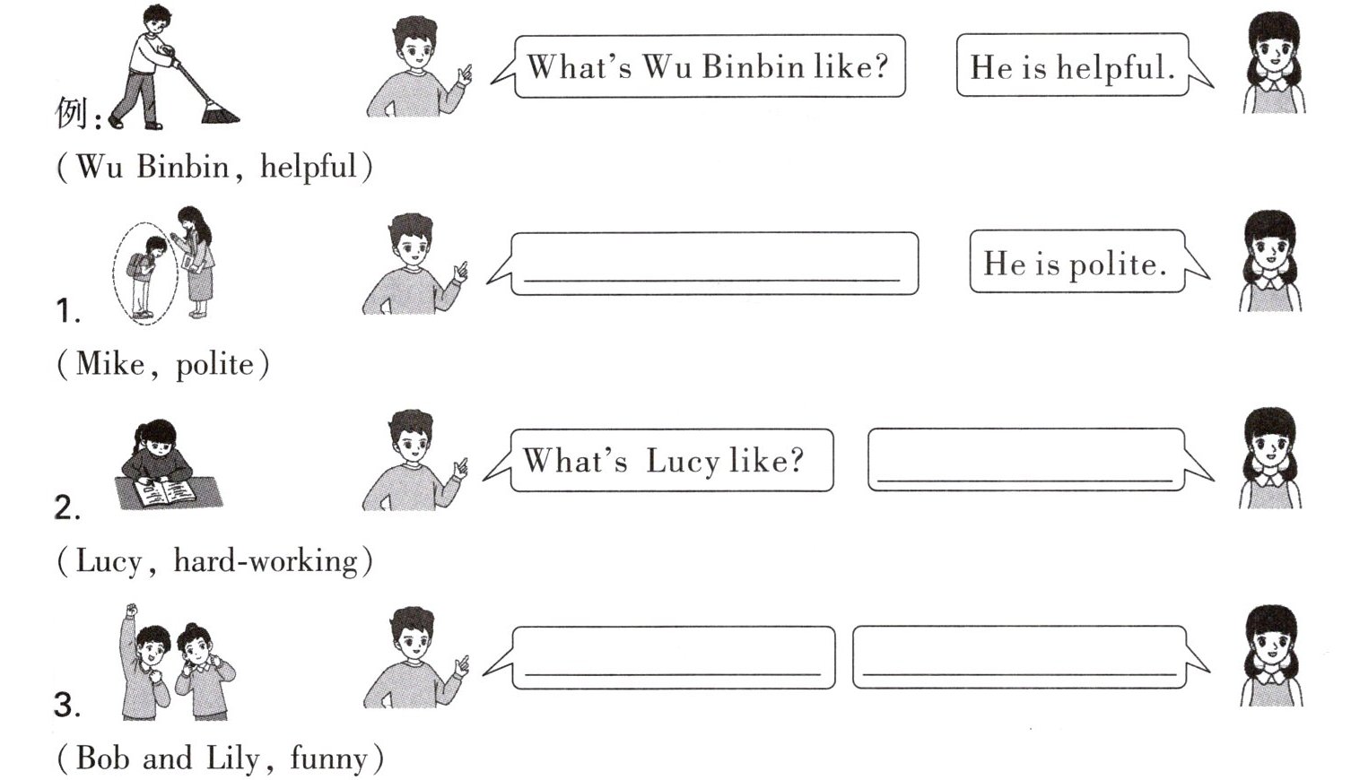 Ⅱ. Read and write. Jack 和陈杰在看班级荣誉墙。请根据同学们的照片及提示,补全对话。