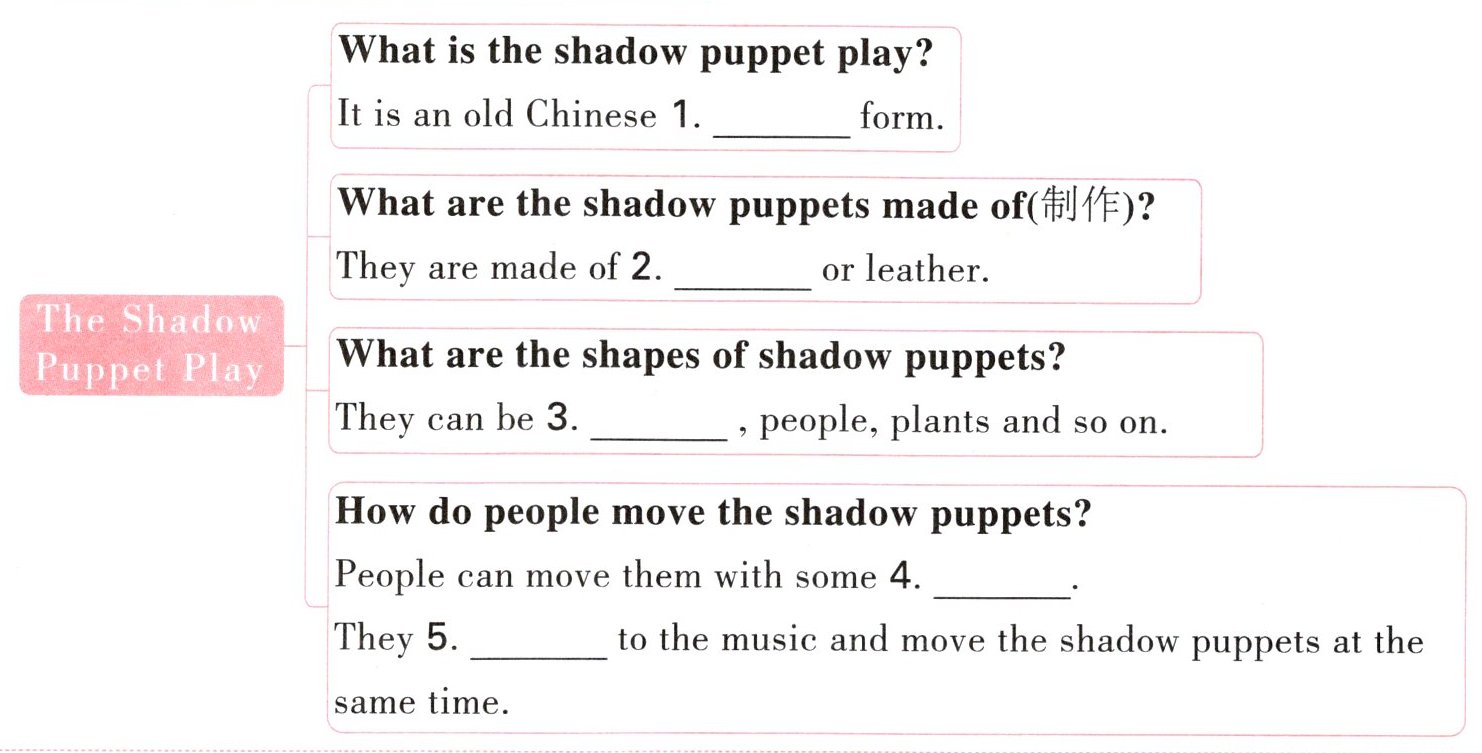Ⅲ. Read and complete. 奇奇和他的哥哥所表演的皮影戏节目别开生面,阅读奇奇给大家分享的关于皮影戏的故事,完成下列任务。