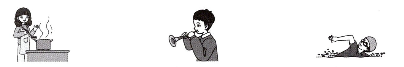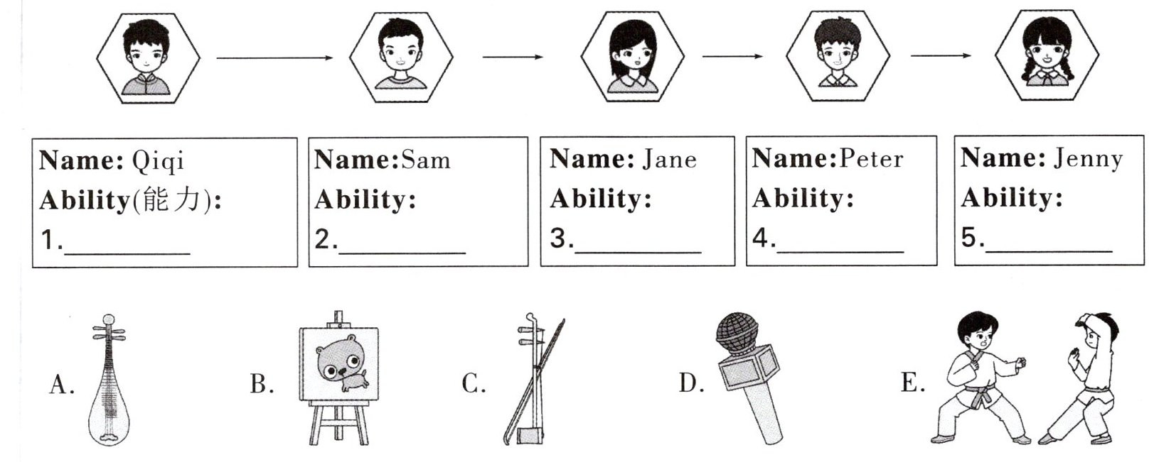 Ⅱ. Listen and choose. 学校文体部正在招新,同学们纷纷前来面试。听对话,选择与人物技能相匹配的图片。(对话听两遍)