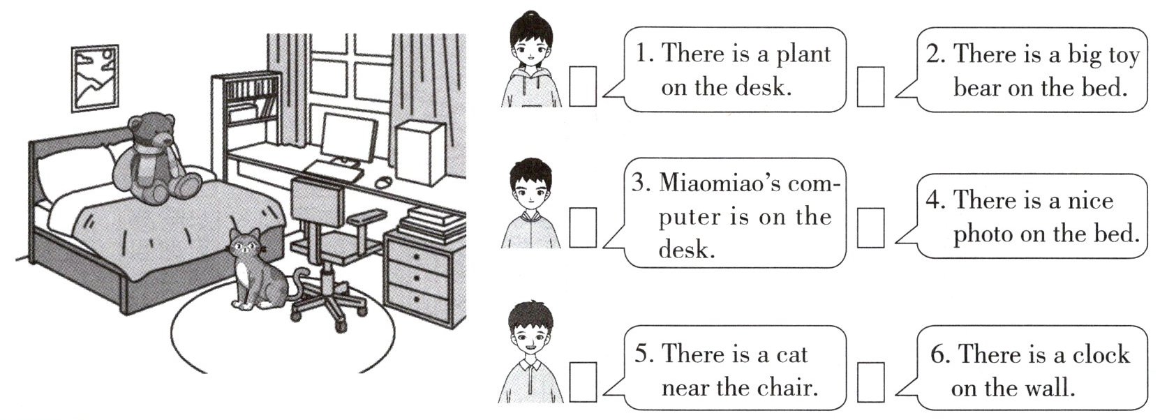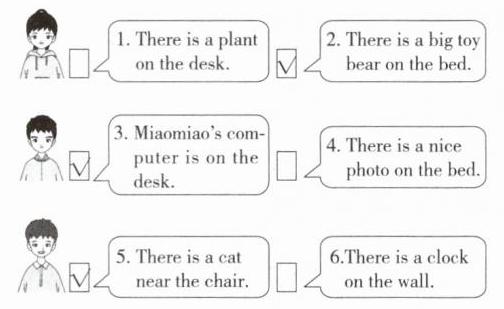 Ⅱ. Read and tick. 大家对妙妙房间的布局充满了好奇。根据图片,在正确的描述前打“√”。