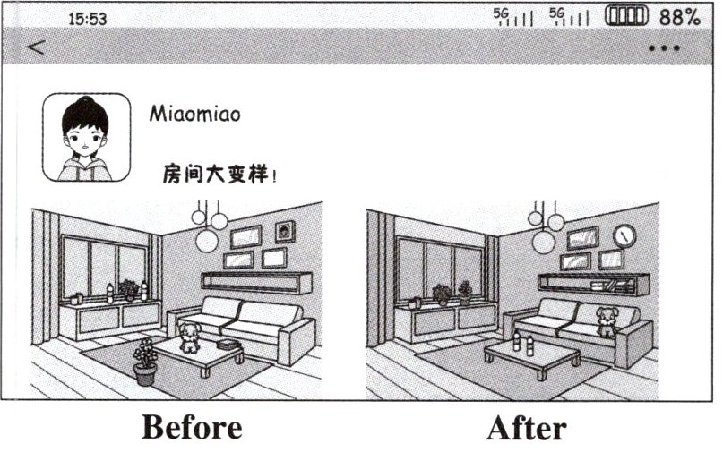 Ⅱ. Read and judge. 妙妙重新整理了客厅,请你根据整理后的物品位置,判断下列句子正(T)误(F)。