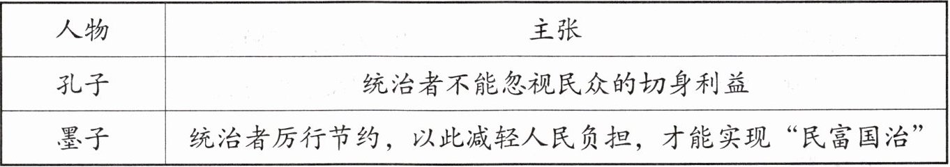 (2)孔子:思想核心是“仁”;孟子:主张实行仁政;墨子:主张“兼爱”“非攻”,反对诸侯攻伐兼并。
