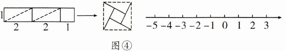 (3)拓展思考:通过动手操作,小敏同学把长为 5,宽为 1 的长方形进行裁剪,拼成如图④所示的大正方形。请借鉴材料中的方法在数轴上找到表示$\sqrt{5} - 1的点P$。(保留作图痕迹并标出必要线段长)