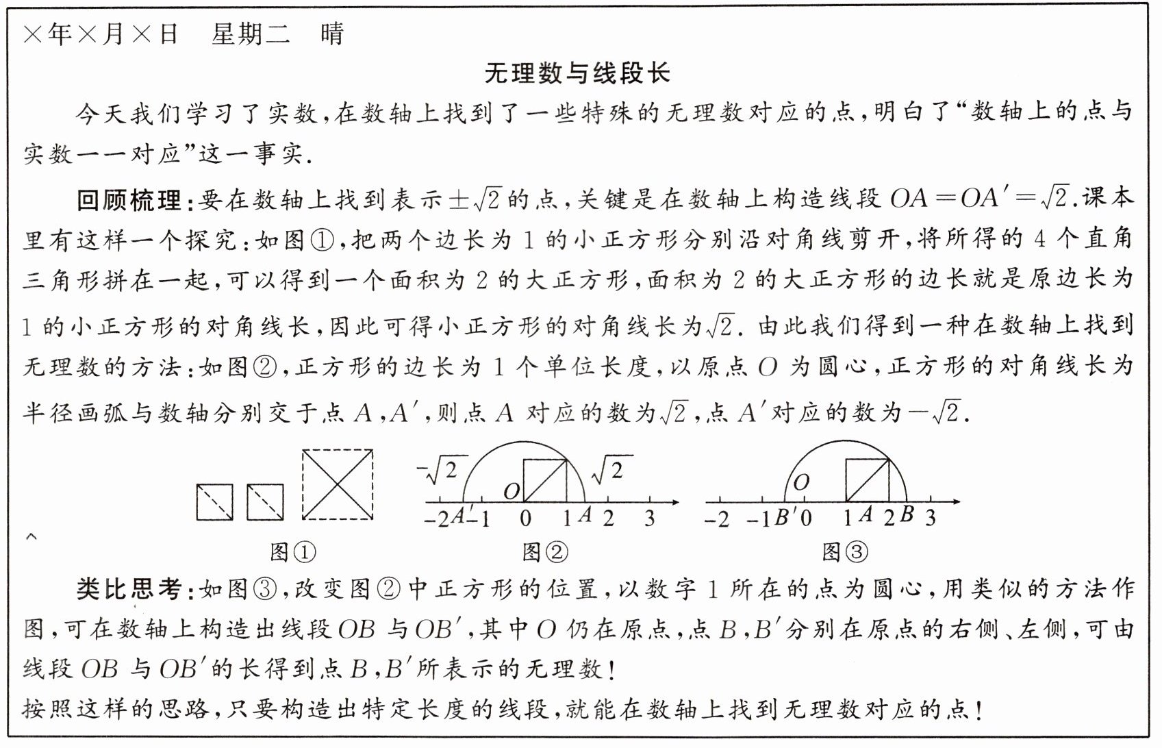[解析]因为正方形的对角线长为$\sqrt{2}$,所以线段OB的长为$1+\sqrt{2}$,$OB'$的长为$\sqrt{2}-1$,点B表示的数为$1+\sqrt{2}$,点$B'$表示的数为$-\sqrt{2}+1$;