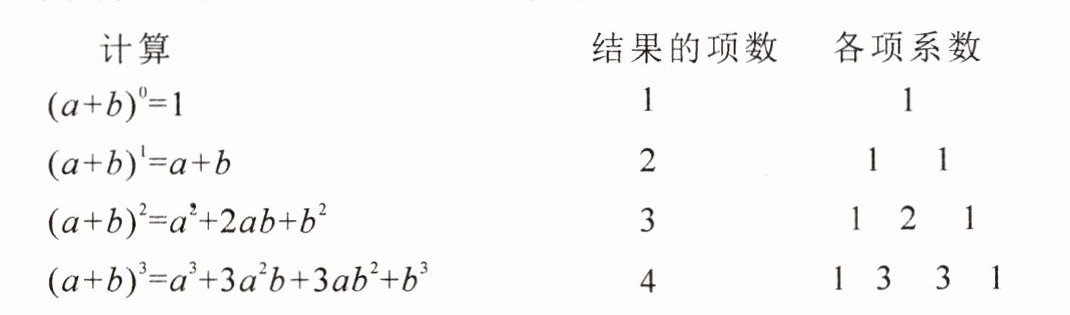 1. 新考向 阅读理解 阅读理解:我们知道$(a + b)^2$展开后等于$a^2 + 2ab + b^2$,我们同样可以利用多项式乘法法则将$(a + b)^3$展开.如果要进一步展开$(a + b)^4$,$(a + b)^5$,你一定发现解决上述问题需要大量的计算,是否有简单的方法呢?我们不妨找找规律!如果将$(a + b)^n$($n$为非负整数)的每一项按字母$a$的次数由大到小排列,就可以得到下面的等式:
