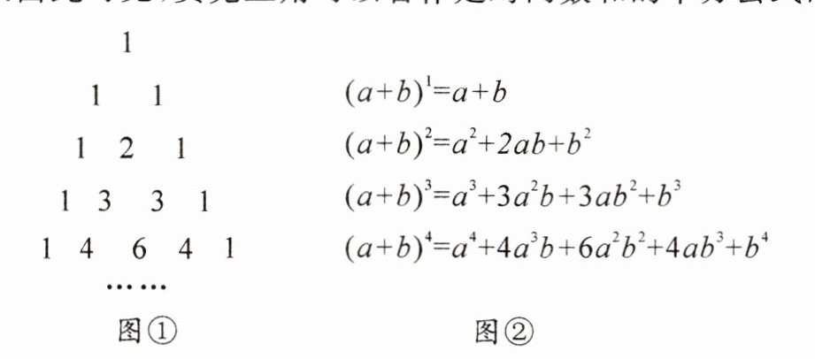 【数学文化】我国古代数学的许多发现都曾位居世界前列,其中“贾宪三角”就是一例.如图,这个三角形的构造法则:两腰上的数都是 1,其余每个数均为其上方左右两数之和,它给出了$(a + b)^n$($n$为正整数)的展开式(按$a$的次数由大到小的顺序排列)的系数规律.例如,在贾宪三角中,第三行的三个数($1$,$2$,$1$)恰好对应着两数和的平方$(a + b)^2的展开式a^2 + 2ab + b^2$的系数.类似的,通过计算可以发现:第四行的四个数($1$,$3$,$3$,$1$)恰好对应着两数和的立方$(a + b)^3的展开式a^3 + 3a^2b + 3ab^2 + b^3$的系数,等等.由此可见,贾宪三角可以看作是对两数和的平方公式的推广.