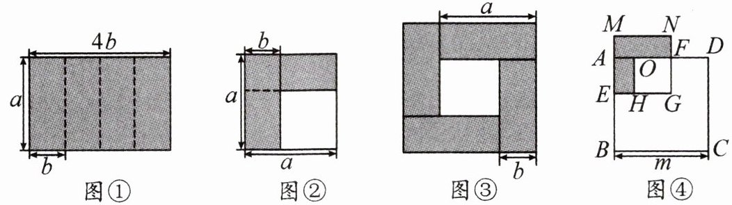 ②如图④,已知正方形 ABCD 的边长为 m,E,F 分别是 AB,AD 上的点,且 $ BE = 4 $,$ DF = 2 $,长方形 AEGF 的面积是 24,分别以 GE,GF 为边作正方形 GEMN 和正方形 GHOF,求阴影部分的面积.