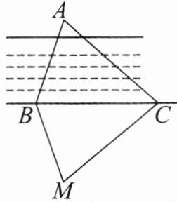11. 如图,为了测量 B 点到河对岸的目标 A 之间的距离,在与 B 点同侧的河岸上选择了一点 C,测得∠ABC = 65°,∠ACB = 30°,然后在 M 处立了标杆,使∠CBM = 65°,∠MCB = 30°,测得 MB 的长是 15 米,则 A,B 两点间的距离为