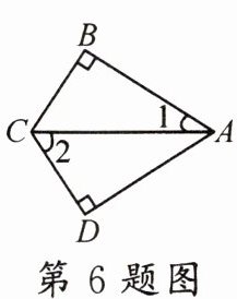 6. (洛阳期中)如图,∠B = ∠D = 90°,BC = CD,∠1 = 40°,则∠2 = (
