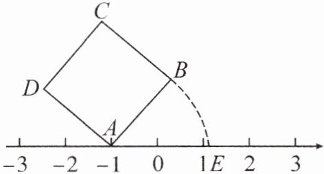 9. 新情境 创新设题 如图, 面积为 5 的正方形 $ABCD$ 的顶点 $A$ 在数轴上, 且表示的数为 $-1$, 若点 $E$ 在数轴上 (点 $E$ 在点 $A$ 的右侧), 且 $AB = AE$, 则点 $E$ 所表示的数为(