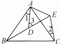 4. 如图,在 $ \triangle ABC $ 和 $ \triangle ADE $ 中,AB = AC,AD = AE,$ \angle BAC = \angle DAE $,且点 B,D,E 在一条直线上,连结 CE。若 $ \angle 1 = 30^{\circ} $,$ \angle 2 = 25^{\circ} $,则 $ \angle 3 $ 的度数为 (